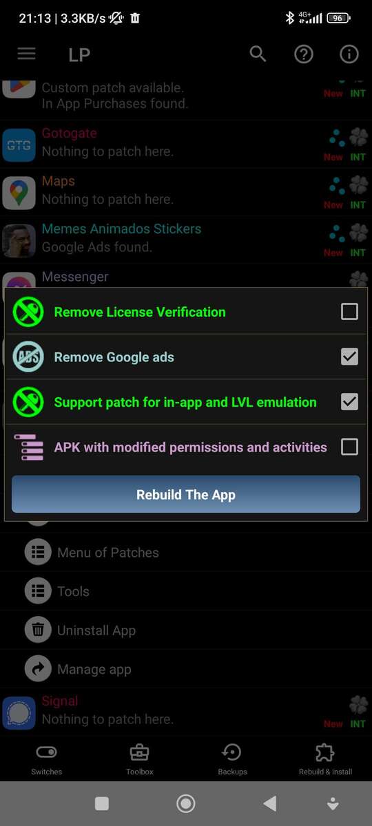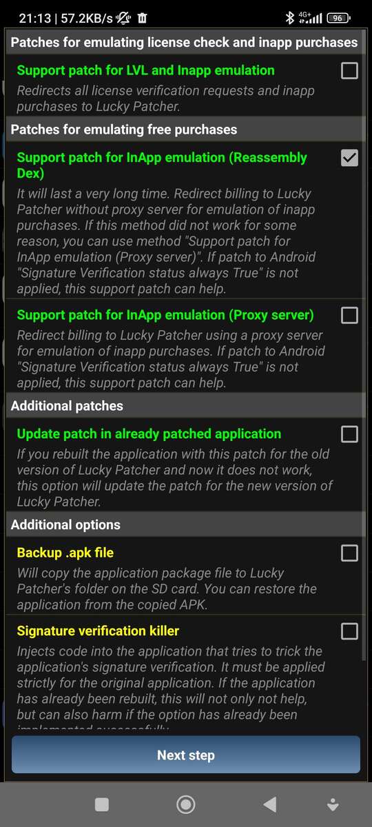 - Instead of Support patch for InApp emulation (Reassembly Dex), try both Support patch for LVL and Inapp emulation and Support patch for Inapp emulation (Proxy server).